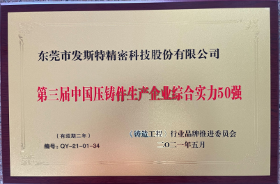 2021年6月,東莞市發(fā)斯特精密科技股份有限公司在由中國鑄造協會會刊《鑄造工程》雜志社主辦,香港鑄造業(yè)總會、廣東省鑄造行業(yè)協會等共同協辦的第三屆“中國壓鑄件生產企業(yè)綜合實力50強(簡稱中國壓鑄50強)的評選活動中,喜獲“中國壓鑄50強“的榮譽稱號。