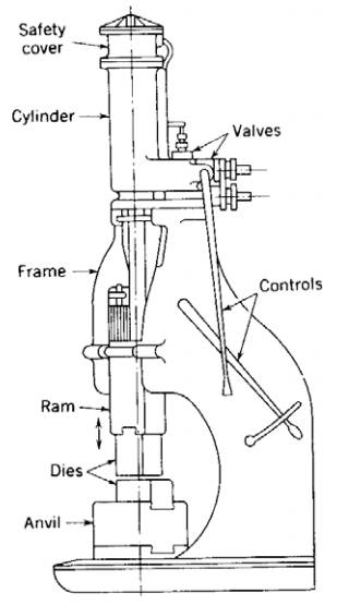 錘鍛或打鐵所用的方式相同,系將工作物加熱到鍛造溫度,在平錘及鉆板之間加以鍛造; 小件可用手工稱為打鐵;大件則須使用蒸氣錘(Steam Hammer),如下圖。其中,工作物放在鉆板與平面錘之間,至于蒸汽錘的構(gòu)造,則依鍛造容量而定,輕型者為單機(jī)架式, 重型者為雙機(jī)架式。