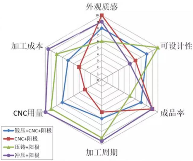 下圖描述了幾種手機(jī)外殼金屬加工工藝在加工成本、CNC用量、加工周期、成品率、可設(shè)計(jì)性、外觀質(zhì)感的比較。