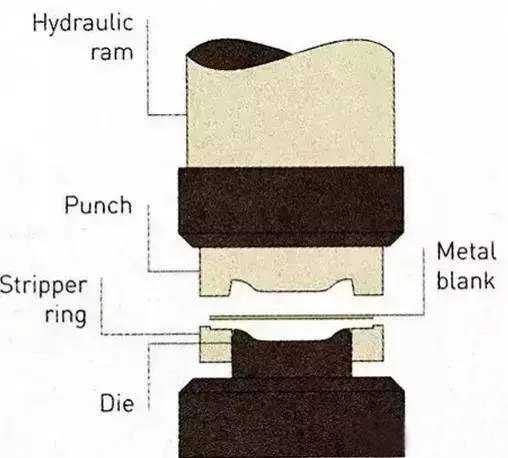 2、上方?jīng)_頭垂直下落,使金屬板材在模具內(nèi)部受力成型